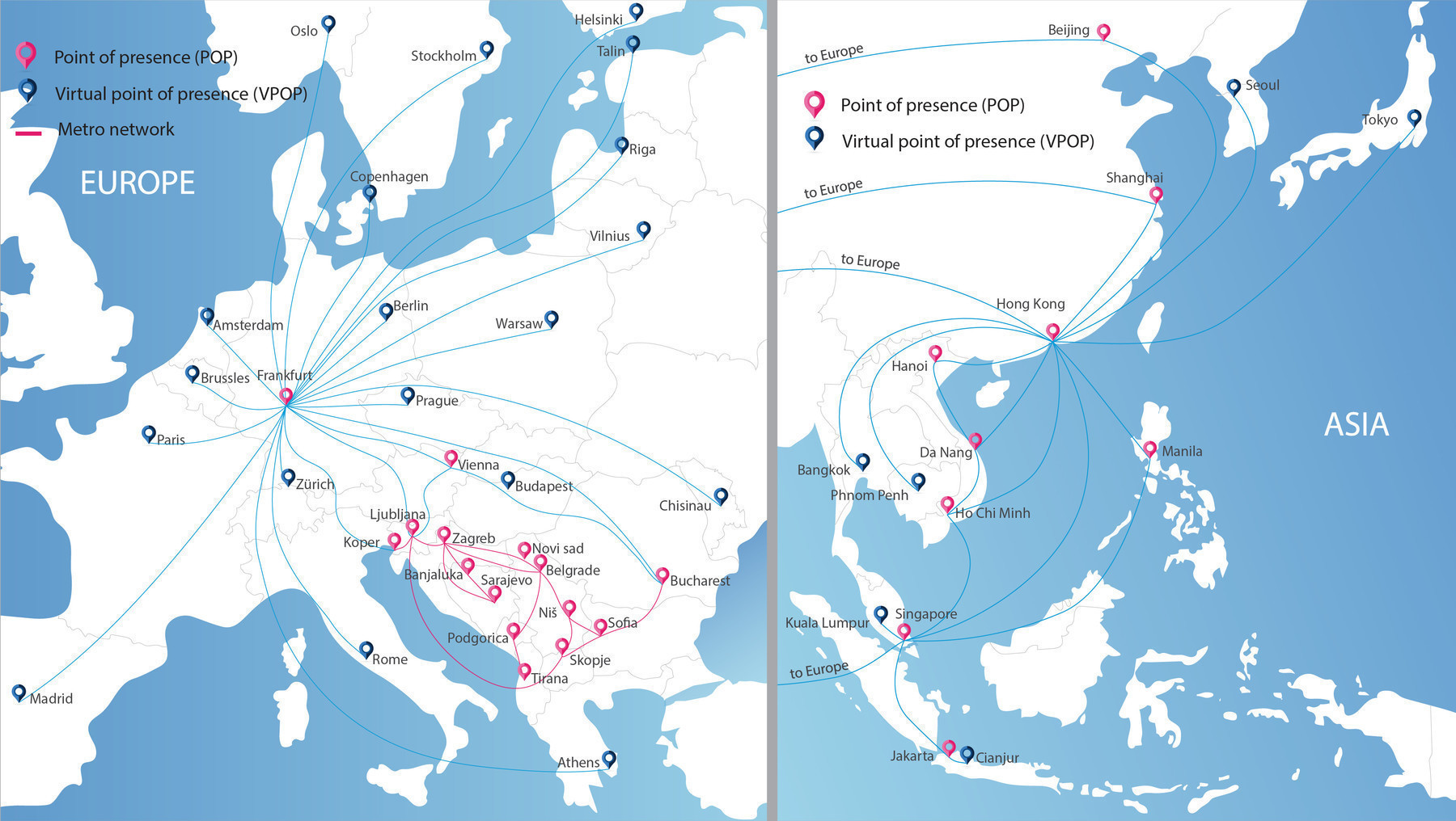 SoftNET Global Network tập trung vào kết nối toàn cầu có độ trễ thấp thông qua các POP do chúng tôi điều hành ở Châu Âu (Đức, Áo, Slovenia, Croatia, Bosnia và Herzegovina, Serbia, Bulgaria, Romania, Macedonia, Montenegro, Albania) và châu Á (Trung Quốc, Việt Nam, Singapore, Indonesia, Philippines).